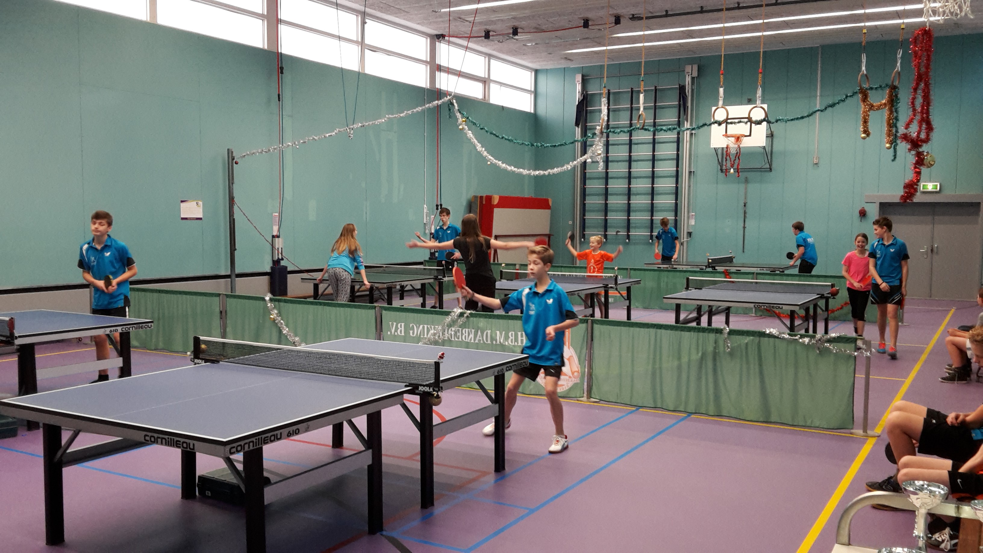 Het was zaterdag 20 december vroeg. Héééél vroeg. De zaal aan de Da Costalaan ging open om 9 uur. De avond ervoor was het senioren Kersttoernooi geweest. Tot in de late uurtjes werd er getafeltennist met als klap op de vuurpijl een bingo begeleid door Roberto. De jeugd toernooibegeleiders keken dus niet allemaal even wakker uit hun ogen. De bardienst werd vakkundig ingevuld door Patrick en Ernst, in de wandelgangen ook wel Jip en Janneke of Bassie en Adriaan genoemd. Ze wisten een formidabele kop koffie te zetten en worden inmiddels geroemd om hun tosti's (hot of niet) en hamburgers. Robert en Dennis zorgden voor de voorwaarden voor een soepel, gezellig en sportief toernooi. Om 9.30 uur was iedereen aanwezig en kon het toernooi met 20 deelnemers van start gaan. In de voorrondes waren er 4 poules van 5. Van elke poule gingen de eerste 2 door naar Poule A, de nummers 3 en 4 naar Poule B en de nummers 5 naar de Aanmoedigingspoule. De voorrondes leverden geen noemenswaardige verrassingen op.